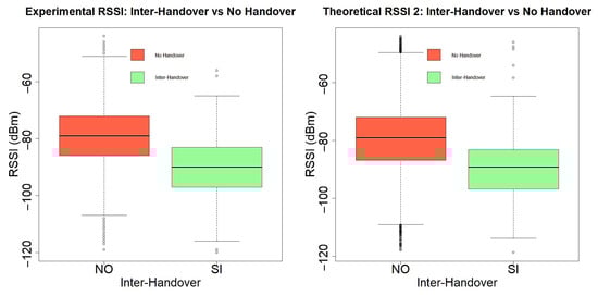 Additionally, Tukey’s post hoc comparisons between the theoretical and experimental RSSI values indicated statistically significant differences under specific mobility conditions. In the inter-handover zone under the SI–SI scenario (i.e., both theoretical and experimental handover detections were positive), the average difference was  () with a confidence interval of , indicating a moderate but statistically relevant discrepancy. In the NO–NO scenario (no handover detected in either case), the difference increased to  () with a tighter confidence interval of , suggesting a consistent and systematic divergence between both models outside of mobility zones.