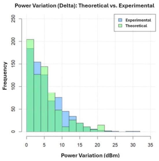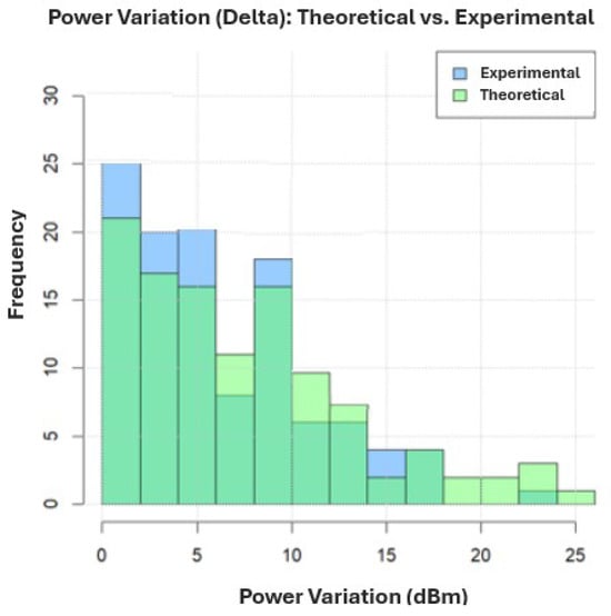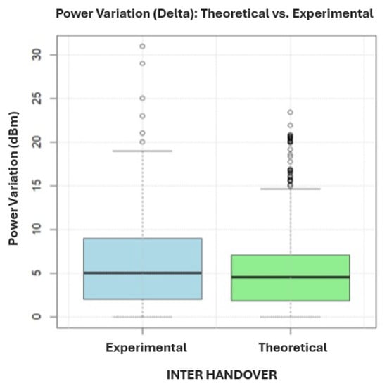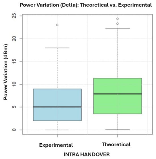 Furthermore, to assess the alignment between theoretical predictions and experimental results, a statistical analysis was conducted comparing the directional power variation derived from Equation (24) with the field measurements. As shown in Figure 13, the majority of measurement points—representing over 85% of the dataset—show a difference of less than 5 dBm between the theoretical and experimental values. This observation was statistically supported by an ANOVA test (), which confirmed that the differences between the two groups (theoretical vs. experimental) were statistically significant but not substantial in magnitude. A post hoc Tukey test revealed that the average discrepancy between the matched theoretical and experimental values across the intra- and inter-handover zones ranged between 3.2 dBm and 3.5 dBm. Based on the maximum observed mean difference and relative to the overall dynamic range of the RSSI values in the dataset, the maximum cumulative error was conservatively estimated at 6.47% and did not exceed 7.6%.