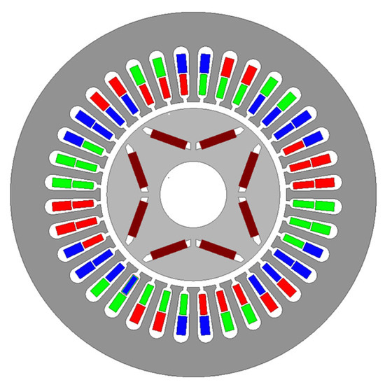 Figure 2 shows a 2D structure of the BIPMSM. The stator of the motor adopts a pear-shaped slot structure, with a distributed double winding arrangement in the slot. The winding method adopts inner and outer double-layer windings placed in the tank, with the inner layer being torque windings of two pairs of poles and the outer layer being suspension windings of three pairs of poles. The rotor adopts a four-pole V-type permanent magnet structure; this topology significantly increases the reluctance torque output. The basic structural parameters of the motor are shown in Table 1 below.