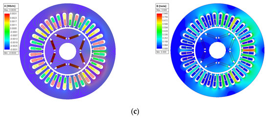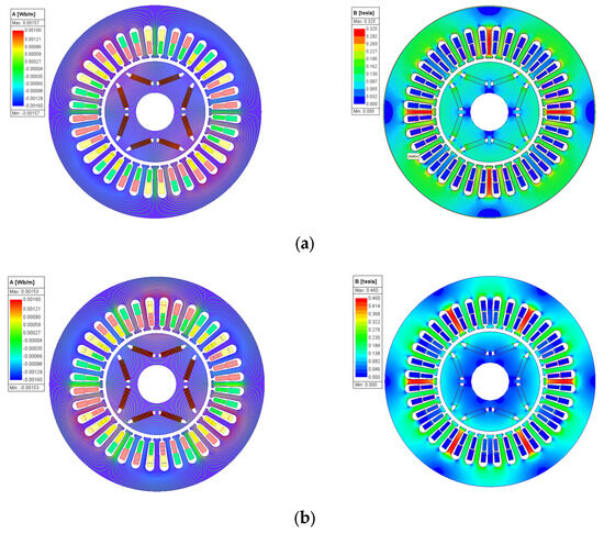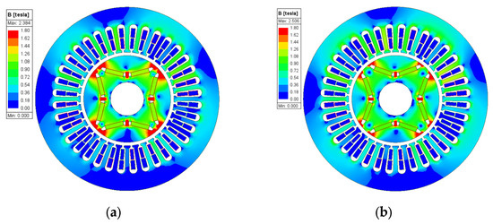 Figure 12 shows the magnetic field strength of the motor obtained through finite element analysis when excited only by permanent magnets. Figure 12a,b shows the magnetic field distribution before and after motor optimization, respectively. Comparison shows that in the optimized magnetic field strength diagram, the magnetic field inside the motor is distributed symmetrically. Symmetrical magnetic field distribution can reduce torque ripple, thereby improving the operating performance of the motor.