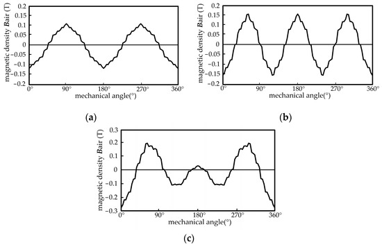 Air-gap magnetic density distribution: (a) when the torque winding current acts alone; (b) when the suspension winding acts alone; (c) when both of the above cases act at the same time.