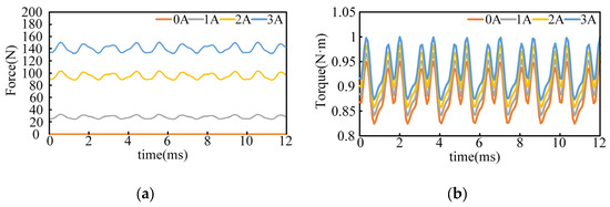 Figure 5a shows the suspension force analysis diagram generated when a series of gradient suspension force currents (0 A, 1 A, 2 A, and 3 A) and a 6 A torque current are applied. It can be observed that as the suspension force current gradually increases, the generated suspension force also increases, while the suspension force ripple similarly grows. Figure 5b displays the variation diagram of output torque under the same working conditions. It demonstrates that changing the suspension force current has minimal impact on the output torque when the torque current remains constant.