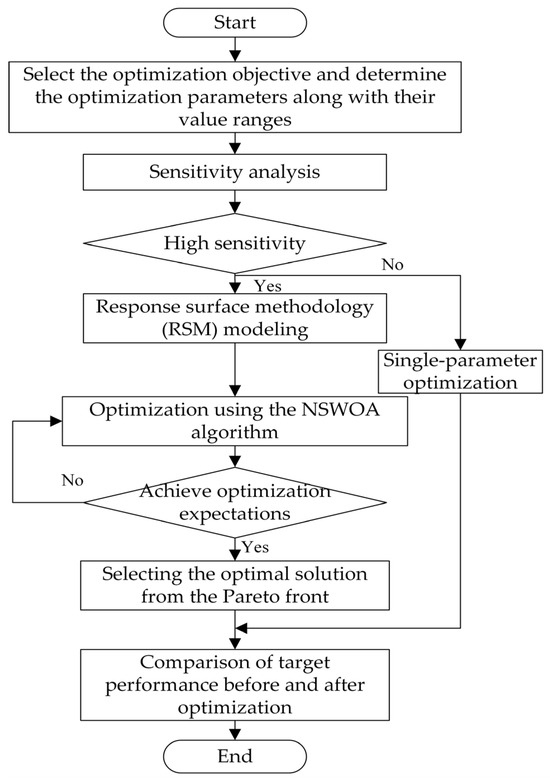 The BIPMSM optimization design method proposed in this paper is an optimization design scheme for BIPMSM based on sensitivity analysis, response surface fitting, and non-dominated sorted WOA. The optimization design flow is shown in Figure 7.