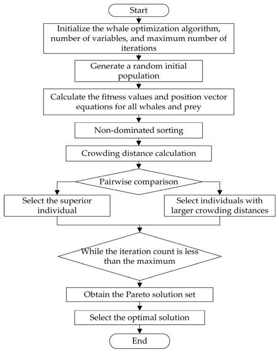 The WOA framework is enhanced for multi-objective optimization by integrating non-dominated sorting and crowding distance metrics, as shown in Figure 6 for the algorithmic flowchart of the MOWOA.