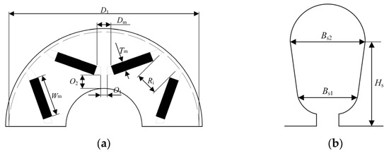 Design variable definition of the BIPMSM: (a) permanent magnets; (b) stator slot.