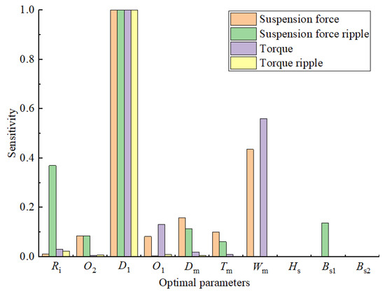 In order to make the optimized BIPMSM have better torque and suspension performance, it is desirable to increase the torque while decreasing its ripple and to increase the suspension force while decreasing its ripple. Four performance metrics, namely, average torque T, torque ripple RT, average suspension force F, and suspension force ripple RF, were selected as the optimization objectives. As shown in Figure 8, in order to study the influence of optimization variables on the above optimization objectives, a total of 10 parameters of the BIPMSM stator slot and permanent magnet structure were selected as optimization variables. Meanwhile, according to the design requirements, the reasonable design ranges of each optimization parameter are given in Table 2. According to the set optimization objectives [31], the constraints can be expressed as