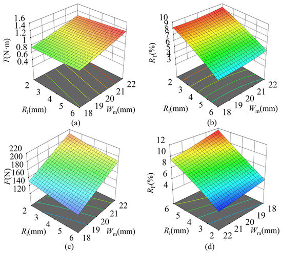 Response surfaces of optimization objectives: (a) Response surface model for T regarding Ri and Wm; (b) Response surface model for RT regarding Ri and Wm; (c) Response surface model for F regarding Ri and Wm; (d) Response surface model for RF regarding Ri and Wm.