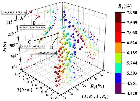 Using MOWOA, global optimization of the objective performance was performed based on the constraints and the objective function obtained from RSM fitting, and the Pareto frontiers containing the four optimization objectives were eventually obtained, as shown in Figure 11. In order to sift the optimal solutions from the Pareto front, the four best solutions (A, B, C, and D) were selected, and one worst solution independent of the four-point solutions was added. The comparison is shown in Table 5.