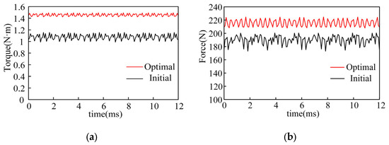 Performance comparison of the initial and optimal design: (a) torque performance; (b) suspension performance.