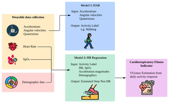 The first model employs a HAR model to classify physical activities based on inertial sensor data. In the second model, the classified activity, combined with physiological signals (heart rate and oxygen saturation), motion features, and demographic information, is used to predict the heart rate the individual would exhibit after completing a standardized step test.