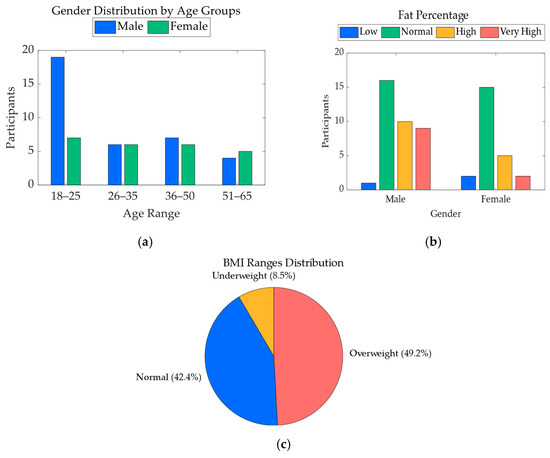 Demographic distribution of study participants. (a) Distribution of participants based on age and gender; (b) distribution of participants by gender and fat percentage ranges; (c) distribution of participants based on BMI ranges.