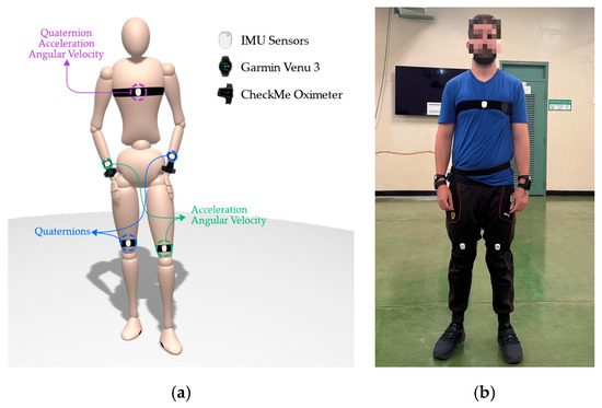 Wearable sensor placement overview. (a) Wearable sensing prototype; (b) human subject instrumented with the proposed sensor setup.