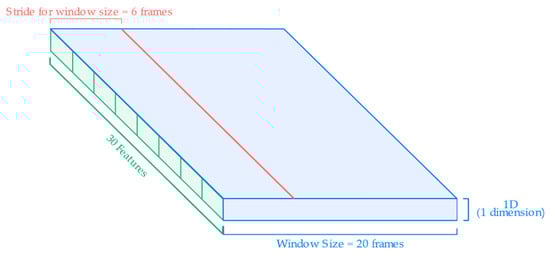 After labeling, the continuous signal was segmented into overlapping sliding windows to create fixed-length samples for input to the neural network. Figure 5 illustrates the segmentation and input structure used for HAR model training. Each input sample consists of a sliding window of 20 frames (0.4 s) and is defined by a set of individual features derived from the wearable sensors. These features include quaternions, linear accelerations, and angular velocities collected from the chest, knees, and hands, based on the specific sensor configuration described in Section 2.2. Each signal component (e.g., x, y, z of acceleration or w, x, y, z of quaternions) is treated as a separate input feature in the model. The windowing process uses a stride of 6 frames, resulting in a 70% overlap between windows. This approach maximizes the temporal resolution of the input while preserving the sequential structure of the movement data.