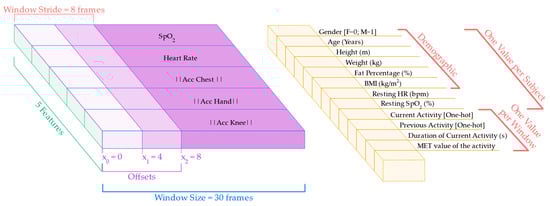 To capture temporal patterns in physiological response, the sequential data was segmented into sliding windows of 30 frames, corresponding to 60 s of continuous activity. This window size was selected to reflect a typical adaptation timescale of HR and SpO2 to physical effort. A stride of 8 frames was used between windows, enabling significant overlap and increasing the number of training samples. Additionally, the segmentation process was repeated using three different offsets (0, 4, and 8 frames), producing multiple views of the same signal and improving robustness against alignment variability.