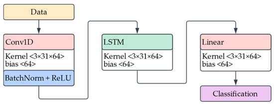 To classify physical activities from wearable motion data, we implemented a deep learning model that combines a one-dimensional CNN with an LSTM layer. The model receives as input a time-series tensor of shape (batch size, time steps, features), where each frame contains multichannel IMU features.