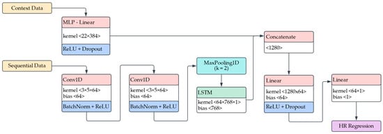 The two branches are concatenated and passed to a fusion module, a two-layer Multilayer Perceptron (MLP) that outputs a scalar prediction of the post-exercise heart rate. Figure 8 gives a visual representation of the architecture description.