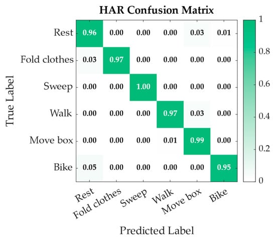 To further assess model performance, we calculated precision, recall, and F1-score using a weighted average to account for potential class imbalance. All three metrics consistently exceeded 95%, suggesting both high sensitivity and precision in detecting a variety of everyday tasks. Figure 9 presents the confusion matrix of the HAR model, summarizing its classification performance across all six activity types.