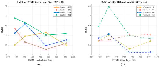 Grid search results show RMSE performance across LSTM, and context hidden sizes. (a) Results for CNN hidden size 32 and (b) Results for CNN hidden size 64. Each line represents a different context MLP layer size, illustrating how LSTM hidden layer size affects the results.