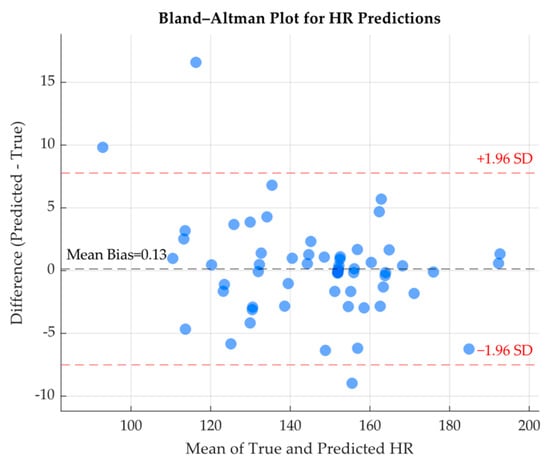 To assess the agreement between predicted and actual values, a Bland–Altman analysis [23] was performed. Figure 11 shows the mean bias between predicted and ground truth post-test heart rate values, which was just 0.13 bpm. Most differences fell within the 95% limits of agreement, suggesting strong alignment and minimal systematic bias in the model’s predictions.