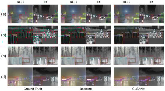 Figure 4d, where strong glare leads to specular highlights and reflections in the visible image, both the RGB- and IR-only baselines incorrectly identify a non-existent motorcycle. CLSANet, through joint consideration of both modalities, is able to suppress such false positives and retain valid target detections, demonstrating its ability to reconcile conflicting modality cues.