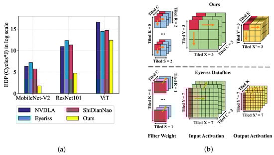 Dataflow comparisons and explanations. (a) We compare the energy-delay-product (EDP, lower is better) between NVDLA, Eyeriss, ShiDianNao, and our DCP. We see that DCP can achieve the best efficiency for all three visual models. (b) We visualize and compare the dataflow of ours and Eyeriss using the first layer of ResNet101. The layer dimensions have been tiled based on the partitioning size of dataflow. The red color labels the tiles to perform parallel computation, and the orange arrow implies the computation order, where represent output/input channels, filter row/column, input row/column, and output row/column, respectively. Our learned dataflow costs only 18.9% read/writes compared to Eyeriss by (i) using a smaller kernel tiled size ( versus in Eyeriss) and smaller tiled output channels (8 versus 4 in Eyeriss) but a larger one for input ( versus in Eyeriss) and (ii) a different computation order of dimensions.