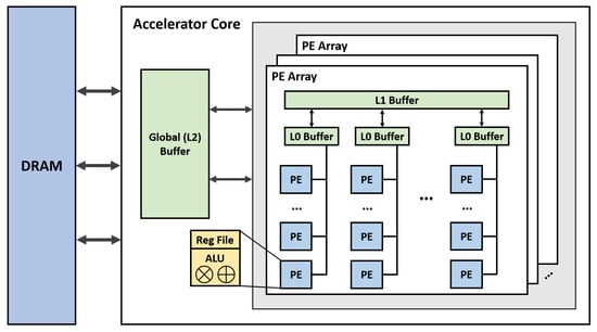Example of DNN accelerator. An abstract DNN accelerator architecture that contains a hierarchical memory system and PE arrays. This abstract DNN accelerator architecture is also used in many DNN accelerators [,,,].
