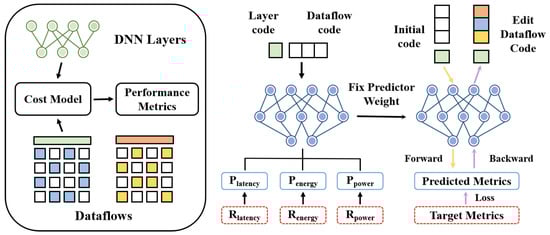 After training the neural predictor, the dataflow optimization becomes ultra-fast by back-propagating along the direction of target metrics’ gradients. As shown in Figure 3, the predictor will forward an initial dataflow code to obtain predicted performance metrics . To minimize (maximize) a metric, we set the target value of the metric as (). Then the weight of the predictor will be fixed to perform the back-propagation with respect to the code of dataflow, returning an optimized dataflow after a certain number of iterations. We investigate optimizing dataflow from layer-level, model-level, and multi-objective perspectives.