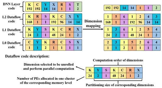 For the coding representation of dataflow, we encode it into a dimensional code, denoted by where . Considering the architecture of the DNN accelerator introduced in Section 2, this “3” refers to the three memory levels of an accelerator. For each memory level, there will be a dimensional code to describe the dataflow of one cluster in the corresponding memory level. As demonstrated in Figure 2, a DNN accelerator may have one L2 cluster and several L1/L0 clusters, which contain a memory buffer and corresponding sub-clusters. The “7” in the dimensional code of each memory level addresses the seven dimensions. Notably, the first dimension indicates a parallel dimension selected from to be unrolled and perform parallel computation. The remaining six dimensions are obtained by reordering the dimensions of in computation order. Then, the two-dimensional code “2” of each dimension contains a number to index the corresponding dimension and an accompanying number. The accompanying number of the parallel dimension specifies how many PEs will be allocated to perform parallel computation. In contrast, the accompanying number of the remaining six dimensions determines their partitioning size. The size of memory buffers in each sub-clusters is calculated by partitioning size, as the buffers store input, output, and weight tensors. In contrast, the size of these tensors is the linear combination of partitioning sizes.