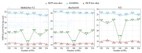 Performance (EDP) on three DNN models of the dataflow searched on different HW settings. Three approaches are compared in this figure. “DCP zero-shot” denotes the dataflow searched with the neural predictor only trained on the 168 PEs, and “DCP few-shot” denotes the dataflow searched with the neural predictor tuned with samples of corresponding PEs. “GAMMA” denotes the dataflow searched by the specifically designed GA algorithm, GAMMA [].
