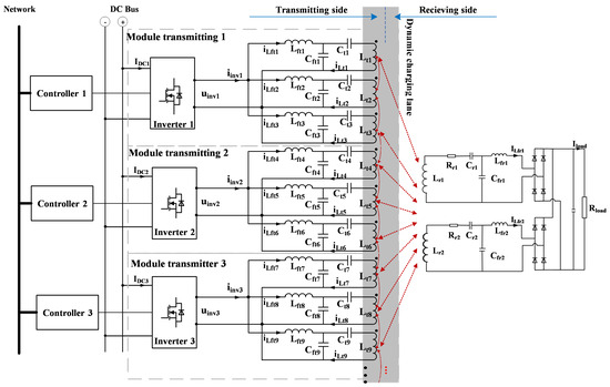 In a DWC system, inductive power transfer is achieved through transmitting coils embedded beneath the roadway and receiving coils installed on the vehicle. Transmitting coils are generally categorized into two types: long-track transmitting coils [6,7,8,9] and segmented transmitting coils [10,11,12,13]. The long-track configuration, when powered in areas without EV presence, leads to decreased energy transfer efficiency and increased electromagnetic field leakage. In contrast, the segmentation approach allows for selective activation, improving efficiency and mitigating stray electromagnetic emissions. Despite these advantages, segmented coil systems introduce a higher system complexity and increased costs. Additionally, the switching of transmitting segments dynamically alters the mutual inductance between transmitting and receiving coils, causing power fluctuations that may induce irregular charging patterns and thermal stress, ultimately affecting battery life [14,15,16]. To mitigate these adverse effects, an optimized control strategy is required to regulate transmitting segment activation based on vehicle position. The objective is to minimize current fluctuation and enhance overall transmission efficiency, ensuring stable power delivery throughout the charging process.