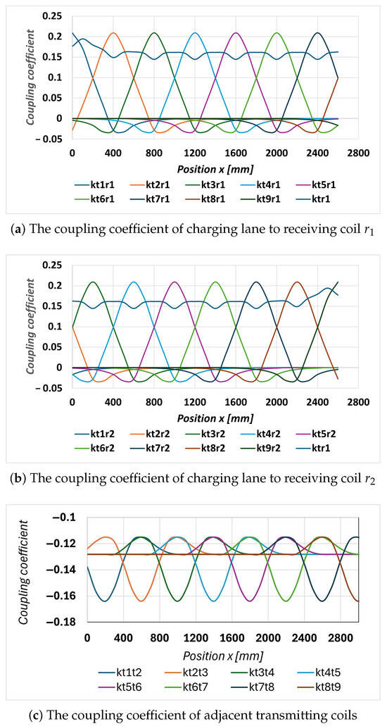 Specifically, Figure 3a,b present the simulated coupling coefficients between the transmitting coils to and receiving coils and , while Figure 3c shows the coupling coefficients between adjacent transmitting coils. The results indicate that the coupling coefficient curves between each transmitting coil and the receiving coils ( or ) follow the same pattern. Due to the movement of the receiver coils, the coupling coefficient (or mutual inductance) between the transmitter and receiver coils can be either positive or negative, depending on the relative position and orientation of the coils. Specifically, the coupling coefficient of the i-th transmitting coil with the receiving coil reaches its maximum value when the center of that transmitting coil is perfectly aligned with the center of the receiving coil. As the receiving coil moves away from this alignment, the coupling coefficient gradually decreases. Moreover, the peaks of the coupling coefficient are spaced at 400 mm, corresponding to the center-to-center distance between adjacent transmitting coils. The average total coupling coefficient between the transmitting coils and each receiving coil () is around 0.14. In addition, the coupling between adjacent transmitting coils is also considerable and included in the system analysis.