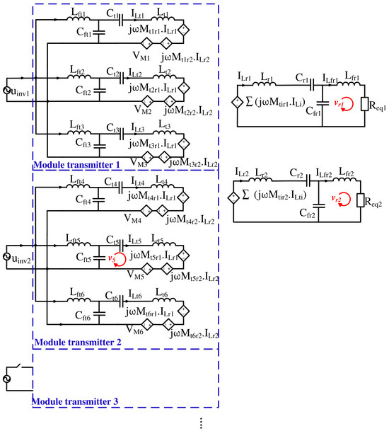 The current challenge is to determine when the electric vehicle reaches this position without using any position-detection sensors. Considering the case where transmitting modules 1 and 2 are activated, and based on the equivalent circuit diagram shown in Figure 4, Kirchhoff’s law is applied to loop :