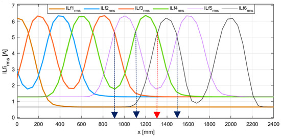 Based on Equations (7)–(9), and (21)–(23), the current characteristics of the compensation inductors , and can be derived as Figure 6. The analysis results indicate that the position x within the range of 1200 mm to 1400 mm can be accurately determined by measuring and comparing the currents in these inductors. Specifically, the position mm is identified when exceeds and simultaneously reaches its maximum value. This condition is introduced to avoid confusion with the position mm. Similarly, the position mm is determined when exceeds and reaches its maximum value, thus distinguishing it from mm. For mm, it is sufficient to compare and ; when is greater than , mm is identified without requiring additional conditions. To simplify and enhance control performance, the position mm is selected as the switching point from module 1 to module 3.