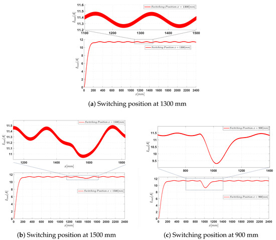 The simulation results of the current according to the position of the transmission coil when performing the switching are shown in Figure 7a. The results show that the load current fluctuation is . To provide a comprehensive basis for evaluating the switching at position mm, switching at other positions was also implemented, and the corresponding results were recorded. The simulation result for switching mm is shown in Figure 7b. In this case, the switching point is determined by comparing and ; switching is performed when . The current pulsation in this case is . Meanwhile, Figure 7c shows the outcome at 900 mm, where switching is triggered when ; the measured current pulsation in this case is . These results demonstrate that switching at mm provides the most favorable current characteristics with the lowest pulsation.