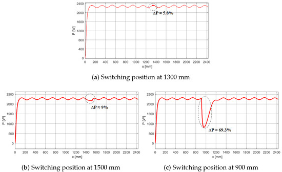 The simulation results of the load power characteristics for the aforementioned cases are presented in Figure 8. The results indicate that switching at the position mm yields the lowest power ripple, at only . At neighboring positions such as mm, the power ripple increases to . Notably, switching at mm results in the highest power ripple, approximately . Based on these findings, it can be concluded that mm is the most suitable switching position, as it significantly minimizes the power ripple during the energy transfer process.
