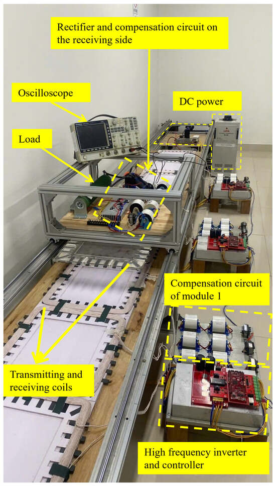 A 3 kW dynamic wireless charging system model for electric vehicles was developed in the laboratory, as shown in Figure 9, with system parameters listed in Table 1 and Table 2. The system consists of two main parts: the transmitting side and the receiving side. The transmitting side includes a charging lane composed of nine transmitting coils, arranged into three modules. Each module consists of three transmitting coils connected to three LCC compensation circuits and shares a single inverter. The receiving side consists of two phases, each comprising one receiving coil, one LCC compensation circuit, and one rectifier. The two phases are connected in parallel and linked to the load. These phases are mounted on a vehicle model, which is placed on a linear motion structure that allows the vehicle to move along the charging lane. Additionally, the receiving coils can be adjusted laterally to simulate vehicle misalignment from the lane center, thereby emulating dynamic charging conditions as described in the theoretical analysis. Owing to spatial constraints within the laboratory environment, the experiments in this study were conducted at a limited speed of approximately 20 km/h. Based on the theoretical analysis, the switching position and the switching position indication based on the inductor current are independent of the movement speed.
