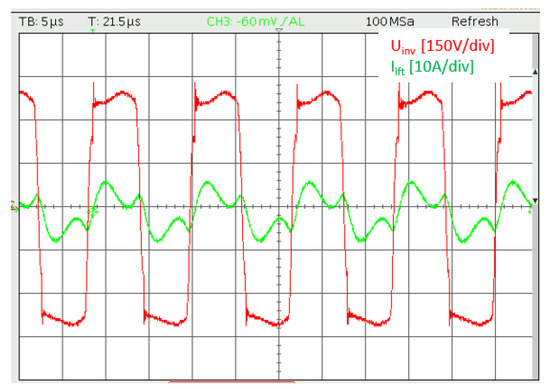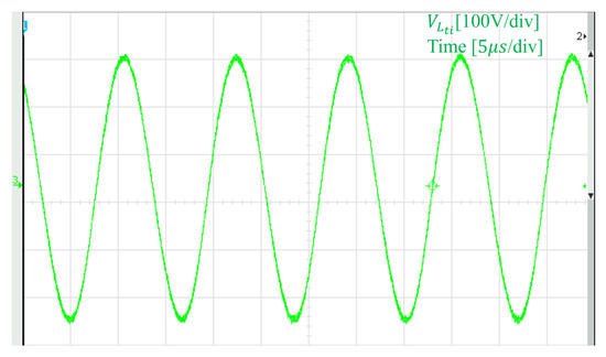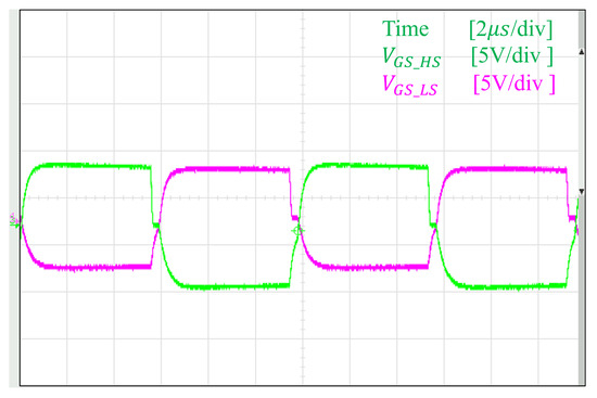 The experimental gate–source (GS) pulse waveforms of two MOSFETs in the same inverter branch are shown in Figure 10. The output voltage and current waveforms of a single inverter module are presented in Figure 11, while the voltage waveforms across the transmission coils are illustrated in Figure 12. The results confirm that the inverter operates at the designed frequency of 85 kHz, and soft-switching is successfully achieved with the specified circuit parameters.