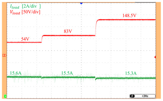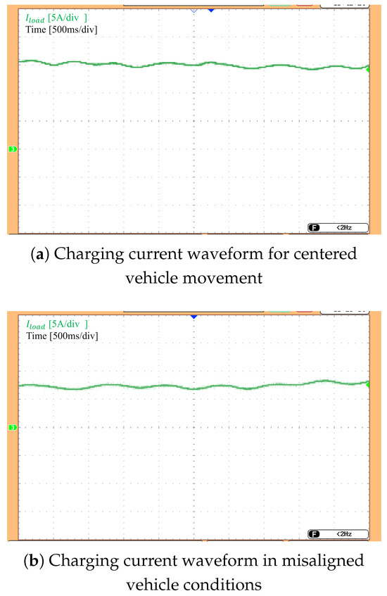 To evaluate the constant current charging capability of the proposed design, a test scenario is constructed as follows: while the vehicle remains on the charging lane, the load resistance is varied to 5.6 , 8.7 , and 16 , respectively. The corresponding voltage and current waveforms at the load are measured and shown in Figure 13. The experimental results of the measured voltage and current waveforms at the load indicate that as the load impedance increases, the load voltage rises accordingly. Meanwhile, the charging current remains stable with a deviation of only about . These findings confirm that the proposed system achieves constant current charging capability, ensuring reliable power transfer even under varying load conditions.