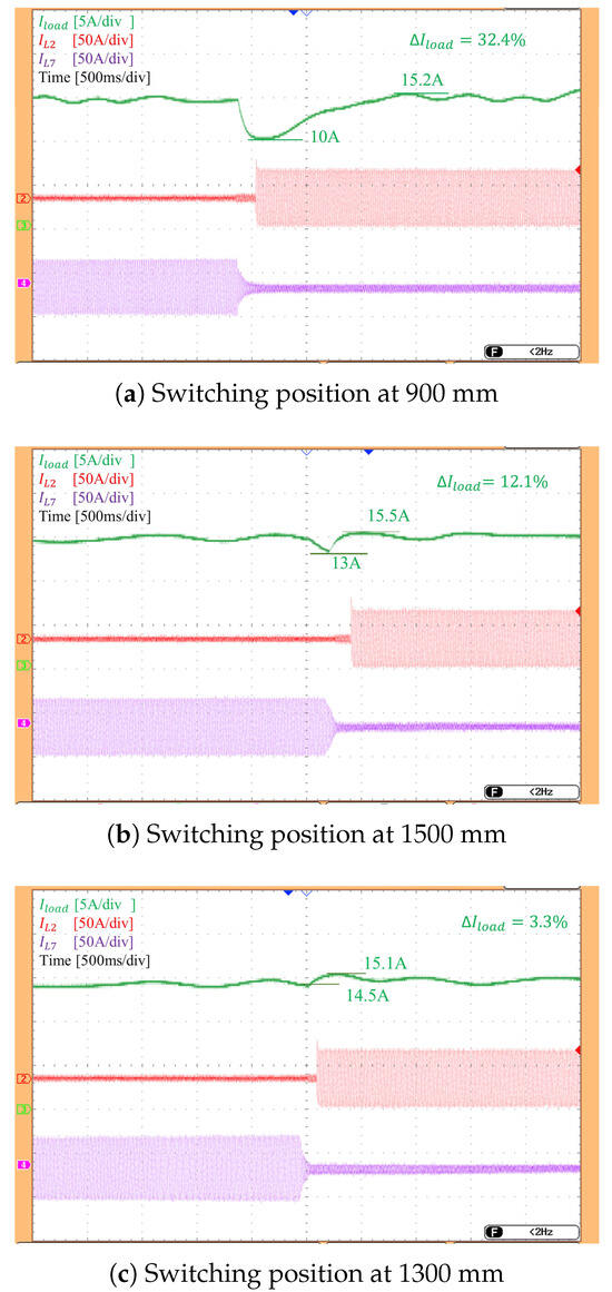 To evaluate the capability of the proposed design to reduce charging current fluctuation during switching at optimal position, a test scenario is constructed as follows: the vehicle model is moved along the charging lane, and switching is performed at 900 mm, 1300 mm, and 1500 mm, as determined from the theoretical analysis. The waveforms of the load current (green), the current in the transmitter coil of module 1 (red), and the current in the transmitter coil of module 2 (purple) are shown in Figure 14.