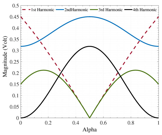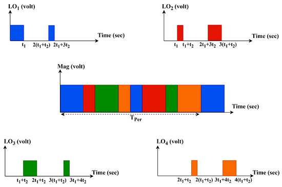 Figure 2 shows the relationship between the clock harmonics magnitudes and . The first four harmonics are illustrated, as this scheme suppresses the rest of the harmonics. The clock harmonics magnitude depends on ; for instance, , the third and fourth harmonics have equal magnitudes, while the first and second harmonics can be easily filtered out. This feature is useful in various wireless systems, such as GNSS reception, particularly for capturing GPS signals L1 (1575.42 MHz) and L5 (1176.45 MHz) using a low-frequency LO of 393 MHz. When , the second and fourth harmonics have high magnitudes, and the first and third harmonics are suppressed. For , the second and third harmonics are significant, the fourth harmonic is suppressed, and the first harmonic can be filtered out. Table 1 displays the varying clock harmonics magnitudes for different values.