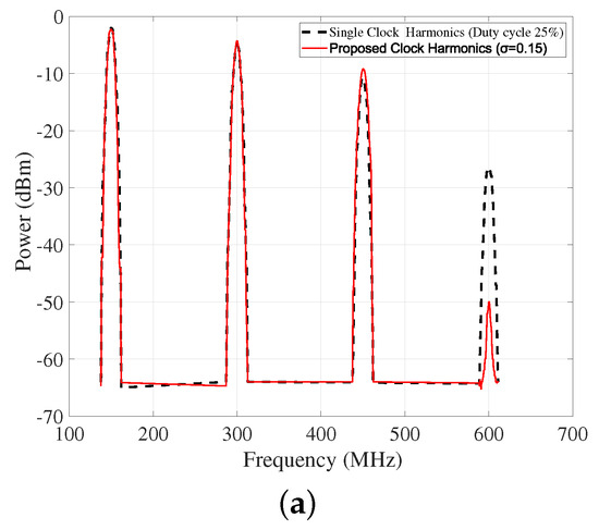 To better highlight the significance of this scheme, Figure 3 compares the harmonic selective clock scheme for , , and with a single uniform clock for a 25% duty cycle. Since a phase-locked loop (PLL) is not integrated on the PCB, an external signal source (Agilent 81130 pulse generator, Keysight Technologies, Santa Rosa, CA, USA) is used to provide the local oscillator (LO) input. Both the single-clock and the proposed multi-phase clocking schemes employ the first four harmonics of a 150 MHz LO signal. The black dashed lines indicate the single uniform clock, while the orange dashed lines illustrate the harmonic selective clock scheme. As shown in Figure 3a, the proposed clock and the single clock with a duty cycle of 25% exhibit identical magnitudes for the first three harmonics. However, a key advantage of the proposed scheme is the significant suppression of the fourth harmonic, which is reduced by approximately 25 dB compared to the single-clock scheme. This harmonic shaping results in a spectrum where the first harmonic can be effectively filtered out, leaving the second and third harmonics with relatively high magnitudes. This selective enhancement of non-harmonically related clock components enables efficient simultaneous downconversion of two distinct frequency bands without relying on integer harmonic relationships, thereby demonstrating a major advantage of the proposed clocking technique. Similarly, in Figure 3b, which targets the downconversion of two frequencies that are not harmonically related, the proposed scheme allows the third and fourth harmonics of the clock to maintain comparable magnitudes. This facilitates effective downconversion using both components. Meanwhile, the first and second harmonics are substantially attenuated and can be easily filtered out. In contrast, the single clock scheme exhibits a significantly weaker fourth harmonic, making it unsuitable for dual band downconversion in this scenario.