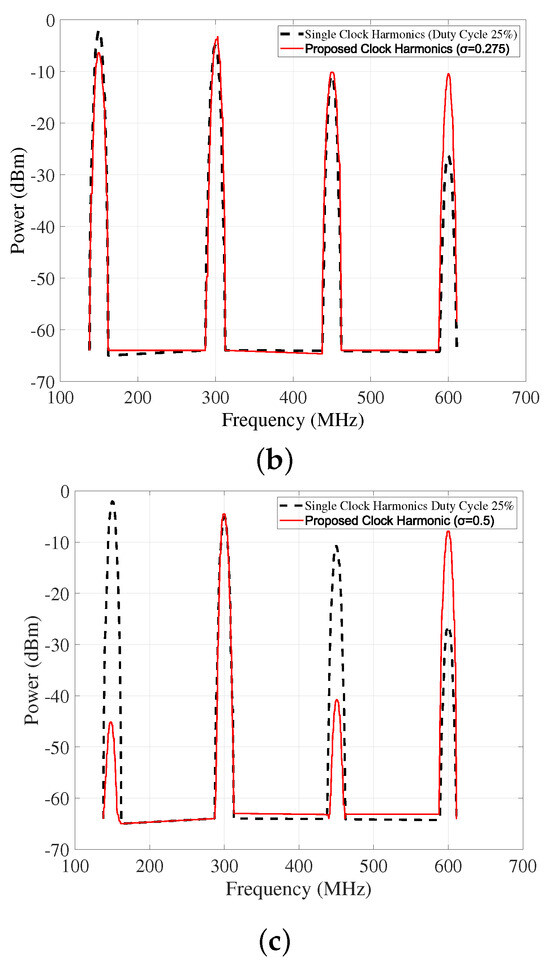 Harmonics of proposed clock vs. uniform clock: (a) , (b) , (c) .