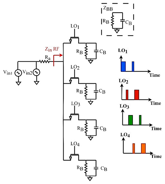 The input signal passes through four MOSFET switches, which are assumed to be ideal in this analysis except for having a nonzero ON resistance denoted by . These four switches are driven by the harmonic-selective clock (non-overlapping) and terminated with four identical baseband loads, , each composed of the parallel combination of a baseband resistance and a baseband capacitance modeled as: