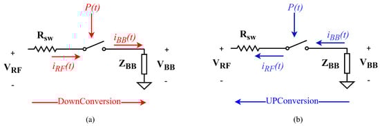 In contrast, Figure 5b illustrates the reverse process that occurs due to the bidirectional nature of the passive switches. Here, the previously generated baseband current is effectively upconverted back to the domain by multiplication with the same clock waveform .