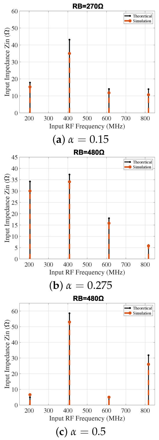 Figure 6 shows the input impedance for , , and with varying values of , computed using Equation (13). For consistency with prior work [3], the switch ON resistance was set to in both the theoretical analysis and ADS harmonic balance simulations. The simulations assume ideal switches, an antenna impedance of , and a baseband capacitance of pF.