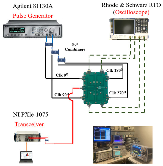 Simulation tests were conducted using the ADS simulator with Envelope simulation, configured to include 32 harmonics for both the frequencies and the local oscillator (LO), ensuring better accuracy and results. The practical setup for the modulated signal tests is shown in Figure 7. Concurrent modulated signals were generated using MATLAB® 2024a and uploaded to the National Instruments PXIe-1075 transceiver, Austin, TX, USA. Harmonic clocks for the proposed architecture were generated using an Agilent 81130A pulse generator configured for two pulse widths. These clocks were then combined and phase-shifted using signal combiners.