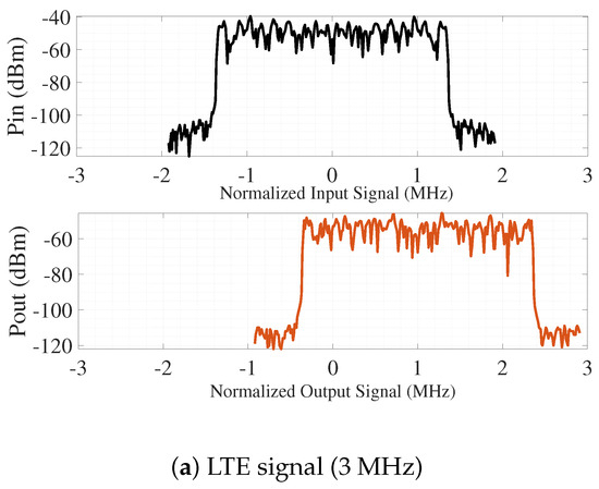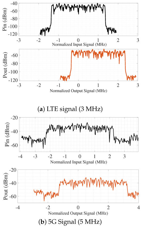 Simulated input and output modulated signals of the proposed concurrent passive receiver for (a) LTE signal (3 MHz) and (b) 5G signal (5 MHz).