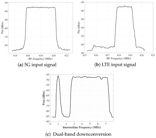 Practical measurement for input signals and corresponding multiband downconverted output: (a) 5G signal centered at 618 MHz with a 5 MHz bandwidth and 64-QAM modulation, (b) LTE signal centered at 818.5 MHz with a 1.4 MHz bandwidth and 64-QAM modulation, and (c) the resulting downconverted output demonstrating simultaneous dual-band reception.