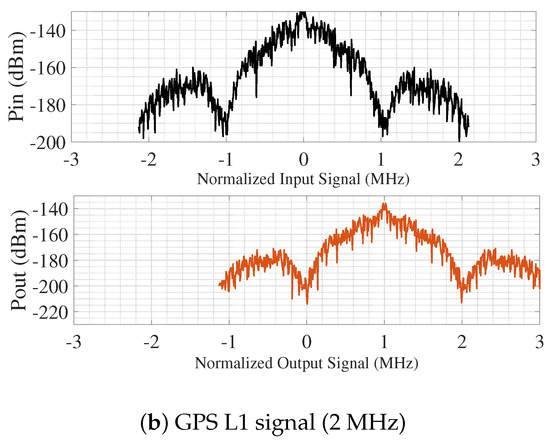 Simulated input and output modulated signals of the proposed concurrent passive receiver for (a) LTE signal (3 MHz) and (b) GPS L1 signal (2 MHz).