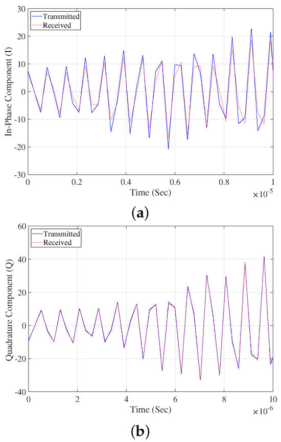 Transmitted and received in-phase (I) (a) and quadrature (Q) (b) signals of an LTE signal having 3 MHz bandwidth at 1179 MHz signal carrier frequency.